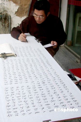 2008年初,被譽(yù)為“倒影王”的廣東惠州市博羅縣居民唐天華用了歷時(shí)三年的時(shí)間,完成了倒影字書法作品《紅樓夢(mèng)》,共計(jì)75萬(wàn)字,使用宣紙1018張,對(duì)齊擺放起來(lái)共1832.4米起長(zhǎng)。中新社發(fā) 宋秀杰 攝