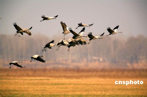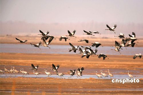一月四日,大批灰鶴在鄭州黃河濕地棲息;寅Q屬于國家級二級保護動物,全世界約有一萬只以上,近日,在鄭州黃河濕地保護區(qū)觀測到灰鶴六百一十二只,屬首次在這里發(fā)現(xiàn)。中新社發(fā) 慎重 攝