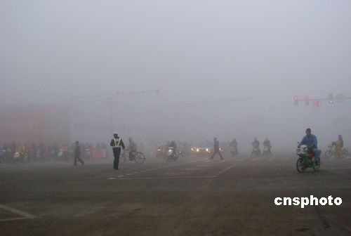 2008年1月7日,江蘇連云港遭遇大霧天氣,能見度不足50米,市民們謹慎出行。“三九”前夕,連云港最高溫度達到12℃,一直保持升高回暖的態(tài)勢,極易形成大霧天氣。中新社發(fā) 耿玉和 攝