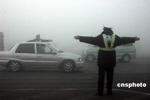 2008年1月7日,一場大霧降臨港城日照,許多路段能見度僅達三至五米。日照市交警直屬大隊啟動惡劣天氣緊急預案,在地勢低洼、靠近河道等重點路段部署大量警力,并啟用聲光等多媒體設備,疏導車輛和人流,確保交通安全。中新社發(fā) 揚文 攝