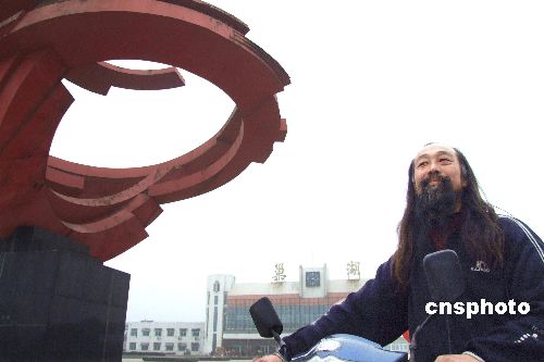 1月10日,創(chuàng)兩項(xiàng)吉尼斯世界紀(jì)錄——“殘疾人騎自行車(chē)穿越羅布泊之最”和“殘疾人騎自行車(chē)游中國(guó)之最”的殘疾人劉郁寶單車(chē)來(lái)到安徽巢湖市。他已行經(jīng)全國(guó)近千座城市,行程六萬(wàn)公里。他此次來(lái)巢湖的目的是,宣傳祖國(guó)和平統(tǒng)一 ,呼吁全社會(huì)關(guān)心和支持殘疾人事業(yè),并為建立“中華史料庫(kù)”搜集史料。中新社發(fā) 張發(fā)平 攝