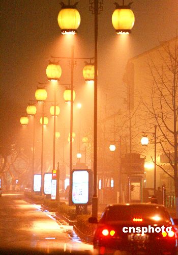 2008年1月10日,古城蘇州再次遭遇霧霾天氣,給城市交通帶來一定影響。然而,夜幕下的古城街頭照明宮燈與建筑物在白茫茫的迷霧中,若隱若現(xiàn),別有韻味。中新社發(fā) 蘇秀 攝