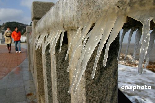 1月14日,受冷空氣影響,江蘇連云港持續(xù)出現(xiàn)大風(fēng)降溫天氣,最低氣溫零下5攝氏度。在偏北風(fēng)作用下海上生成巨浪,濺在海岸邊護(hù)欄上的海水凍結(jié)成冰凌。中新社發(fā) 王健民 攝