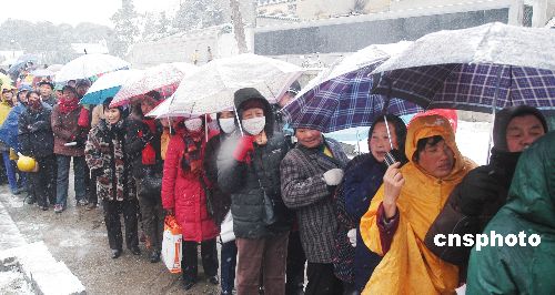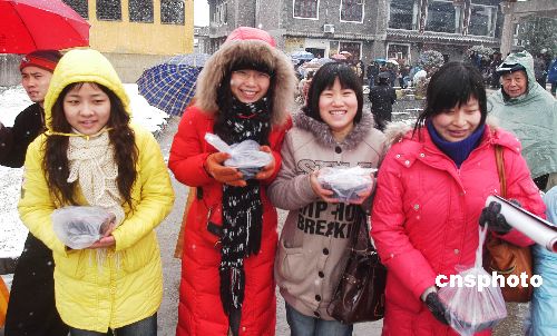 1月15日上午9時(shí),江蘇揚(yáng)州大明寺臘八節(jié)放粥送福發(fā)放處,近千市民冒雪排長(zhǎng)隊(duì)領(lǐng)取免費(fèi)臘八粥和“!弊。當(dāng)日清晨5時(shí),該寺廟開(kāi)始放粥送;顒(dòng)。中新社發(fā) 范友林 攝