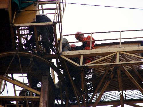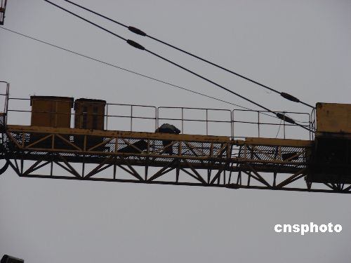 一月十八日,廣西南寧市青秀區(qū)一工地內(nèi),一名民工因索要誤工費、醫(yī)藥費未果,爬上六十米高的塔吊揚言自殺。滿足其條件后,該民工因在塔吊上喝了一瓶白酒不能自己下來。中新社發(fā) 胡明軍 攝