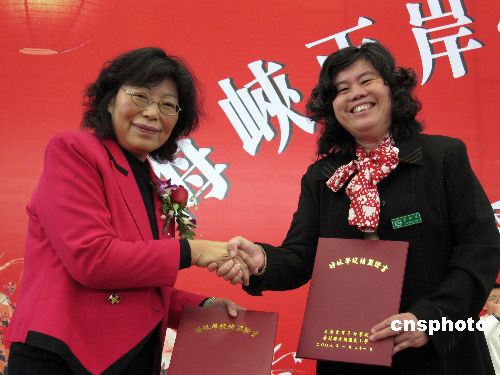 一月二十一日,上海臺商子女學(xué)校代理校長劉遼萍(左),與臺北縣秀朗“國小”校長葉瑞芬在上海簽約締結(jié)姊妹學(xué)校。今后,雙方師生將展開交流和研習(xí)活動。據(jù)了解,大陸目前有三所專門服務(wù)于臺商子女的學(xué)校。中新社發(fā) 潘索菲 攝