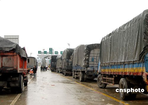 1月22日,在滬昆高速湖南邵陽(yáng)懷化段洞口入口處,等待通行的車輛排起長(zhǎng)龍。連日持續(xù)冰凍天氣,導(dǎo)致滬昆高速邵陽(yáng)至懷化段的橋梁、涵洞全部冰凍,車輛無(wú)法通行,造成公路封閉。有關(guān)部門正采取措施,疏導(dǎo)滯留車輛。中新社發(fā) 滕治中 攝