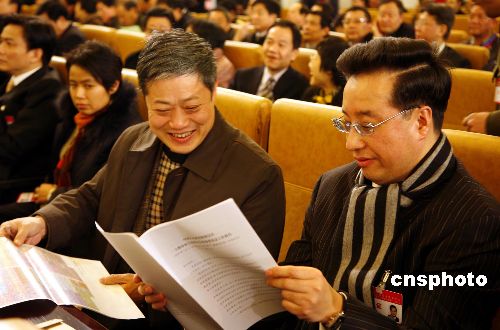 一月二十三日,政協(xié)上海市第十一屆一次會議開幕,香港房地產(chǎn)企業(yè)家屠海鳴(右)與上海恒源祥董事長劉瑞旗出席會議時進行交談。他們表示,將對上海的地產(chǎn)、交通、金融和文化等方面提出各自的建議。中新社發(fā) 潘索菲 攝