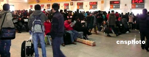 1月26日下午,受強(qiáng)雨雪天氣影響,揚(yáng)州通往外地的高速公路全部關(guān)閉,大批返鄉(xiāng)過(guò)年的旅客滯留。揚(yáng)州汽車(chē)站西站啟動(dòng)應(yīng)急預(yù)案,在售票大廳特別立牌打出停班信息,開(kāi)設(shè)退票窗口。據(jù)江蘇省氣象局分析,從1月25日夜到29日,江蘇將出現(xiàn)持續(xù)性降雪天氣,較大降雪將出現(xiàn)在27日至28日,氣溫持續(xù)偏低,會(huì)出現(xiàn)冰凍。中新社發(fā) 崔佳明 攝