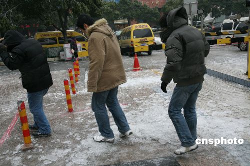 一月二十六日,江西四十二個(gè)縣市出現(xiàn)凍雨,是該省近二十年來(lái)遭遇的最嚴(yán)重凍雨(雨滴與地面或地物等接觸即凍結(jié)的雨)天氣。由于持續(xù)嚴(yán)寒,整個(gè)江西省儼然一個(gè)諾大的“滑冰場(chǎng)”,滿街跑的盡是“凍車族”。中新社發(fā) 吳慶才 攝