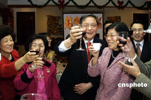 中國(guó)駐美大使周文重(中)及夫人謝淑敏女士(左一)和駐美使館領(lǐng)事部全體外交官1月26日來(lái)到華盛頓特區(qū)唐人街,向大華府地區(qū)各僑社領(lǐng)袖拜年。圖為周文重大使向僑領(lǐng)敬酒。中新社發(fā) 邱江波 攝