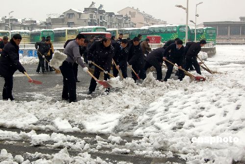 1月27日,蘇州市汽車南站的工作人員正在清理車站內(nèi)的積雪。受昨天強(qiáng)降雪影響,蘇州汽車站長途客運(yùn)班線全線停開,只是保留周邊縣市短途線路,給數(shù)萬旅客出行帶來不便。中新社發(fā) 邱勇 攝