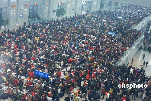 2008年1月27日下午,武昌火車站候車室內(nèi)擠滿了等待乘車的旅客。當(dāng)日,受雨雪天氣影響,廣鐵集團(tuán)湖南境內(nèi)京廣線供電接觸網(wǎng)多處斷電,電力機(jī)車無法通行,致使旅客列車出現(xiàn)多列晚點(diǎn)。武昌火車站采取措施,在新落成的候車室內(nèi)開通暖氣,確保滯留旅客不受凍。中新社發(fā) 宋建春 攝