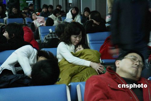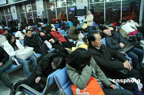 1月27日消息,1月13日以來(lái),湖南省遭遇1954年以來(lái),50年不遇的、持續(xù)時(shí)間最長(zhǎng)、氣溫最低的冰凍天氣,長(zhǎng)沙機(jī)場(chǎng)受冰雪天氣影響,飛機(jī)跑道結(jié)冰,導(dǎo)致大面積航班取消或延誤,25日當(dāng)晚19點(diǎn)15分機(jī)場(chǎng)開(kāi)始關(guān)閉,場(chǎng)內(nèi)2000多名已辦登機(jī)手續(xù)或途經(jīng)此中轉(zhuǎn)的返鄉(xiāng)乘客滯留在候機(jī)廳內(nèi)。中新社發(fā) 蘇巧帥 攝