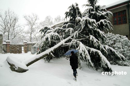 1月28日,巢湖市一生活區(qū)內(nèi)一株有30年樹齡的雪松被樹上積雪壓倒。近日,安徽巢湖市遭遇罕見暴雪襲擊,積雪深度達(dá)20公分以上。中新社發(fā) 徐振華 攝