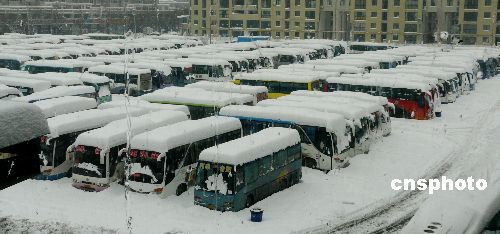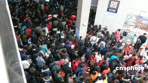 1月27日18點 、28日6點安徽省合肥市兩次發(fā)布暴雪紅色警報。1月28日,在合肥火車站廣場上,上萬名旅客在暴雪中排隊購票。合肥汽車客運全線停運,鐵路客運乘客猛增。暴雪同樣導致了多趟列車晚點,火車站站臺上、大廳內(nèi)擠滿了急于返鄉(xiāng)的民工。由于鐵路部門也無法確定火車進站的具體時間。部分旅客在站臺吃方便面充饑御寒,等待列車的到來。目前合肥火車站正全力疏導,安撫旅客。中新社發(fā) 成展鵬 李君 攝