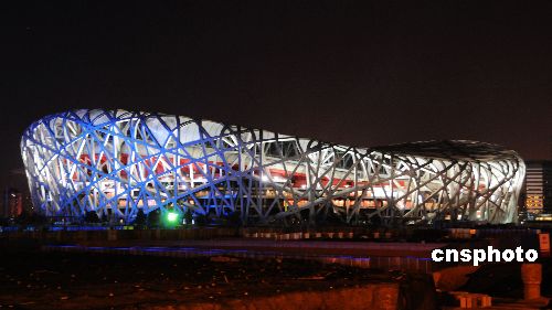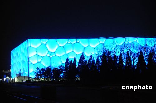 1月29日晚,北京國家體育場(鳥巢)景觀燈亮了,與國家游泳中心(水立方)遙相輝映。中新社發(fā) 馮軍(北京) 攝