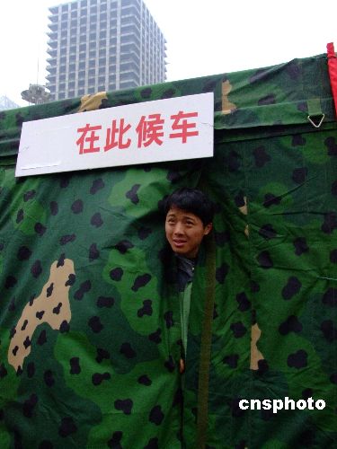 1月31日,滯留旅客在南京軍區(qū)“硬骨頭六連”所在師官兵搭建的“野戰(zhàn)帳篷”里避寒。帳篷內(nèi)持續(xù)供暖,溫度達(dá)到23度左右。目前,該師共在杭州城站火車站、火車東站等地搭建野戰(zhàn)帳篷40多頂,鋪設(shè)床板500多塊,為近2萬名滯留旅客提供了暖身御寒之地,受到廣大群眾的廣泛贊譽。中新社發(fā) 邱柏星 攝