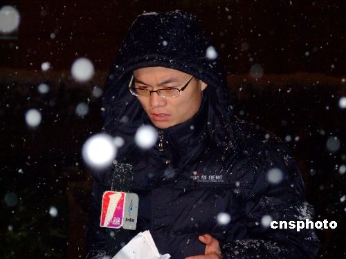 2月1日晚11點,浙江電視臺記者冒著大雪在杭州火車站現(xiàn)場采訪。連日來,杭州持續(xù)低溫、強降雪,導(dǎo)致旅客大量滯留。中新社發(fā) 邱柏星 攝