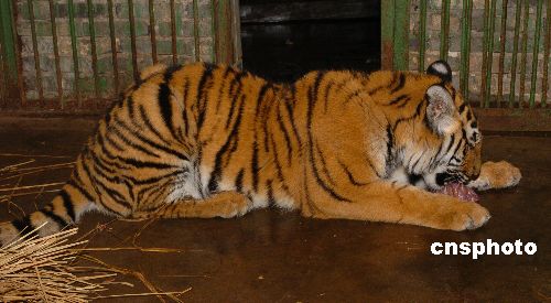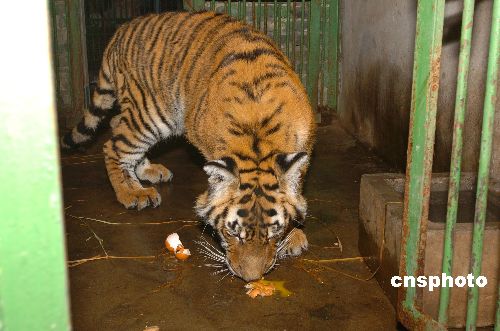2月4日,在南昌動物園,華南虎“明明”正津津有味吃著飼養(yǎng)員送來的新鮮豬肉!懊髅鳌(原名華華)出生于上海,其父是南昌動物園寄養(yǎng)在上海的雄性虎。它約半歲時運回南昌,與成年虎相比,這只小華南虎特別活潑好動,惹人喜愛。由于患有雙目先天性白內(nèi)障,小虎走路時經(jīng)常碰壁,并且總是憑嗅覺發(fā)現(xiàn)食物。1月27日,南昌大學二附院眼科專家為小華南虎成功實施國內(nèi)首例華南虎白內(nèi)障摘除術。經(jīng)過一個星期的術后恢復,情況良好的小華南虎被送往籠舍重新恢復與游客見面。為紀念小華南虎獲得健康視覺,南昌動物園將華南虎“華華”更名為“明明”。中新社發(fā) 朱文標 攝