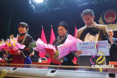 2月4日,貴州省委、省政府召開電視電話會議,表彰抗雪災犧牲在崗位上的民警歐光權(quán)。歐光權(quán)是貴州省臺江縣看守所民警,在抗雪災一線超負荷工作,1月21日因積勞成疾突發(fā)腦溢血倒在崗位上,經(jīng)搶救無效光榮犧牲,終年57歲。2月2日,公安部部長孟建柱簽署命令,追授歐光權(quán)為全國公安二級英模。表彰會上有關(guān)領(lǐng)導一次性向歐光權(quán)的家屬頒發(fā)獎金21萬元。中新社發(fā) 吳東俊 攝