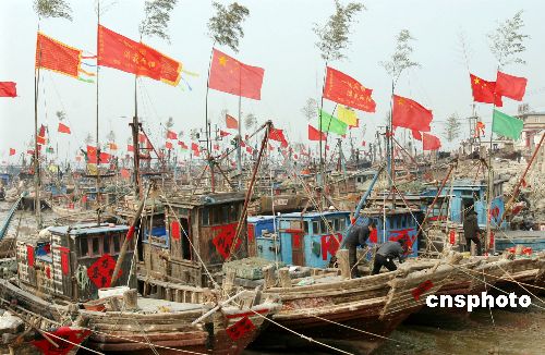 2月5日,在連云港市沿海漁村,漁民們沿襲傳統(tǒng)的漁家過年習俗。春節(jié)前,漁民在漁船上掛紅旗、貼財神、放鞭炮,插上寓意“搖錢樹”的毛竹,以祈福納祥,祈求來年新春漁業(yè)豐產(chǎn)豐收。中新社發(fā) 王健民 攝