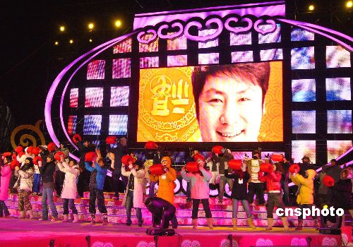 2008年2月5日,在“鳥(niǎo)巢”旁的春晚舞臺(tái)上演員們頂著四至五級(jí)的寒風(fēng)進(jìn)行最后的彩排合練,從下午開(kāi)始一直到夜幕降臨,他們一遍遍的認(rèn)真排練,力爭(zhēng)以最好的演出狀態(tài)在除夕夜為奧運(yùn)建設(shè)者獻(xiàn)上一臺(tái)精彩的演出。中新社發(fā) 玉龍 攝