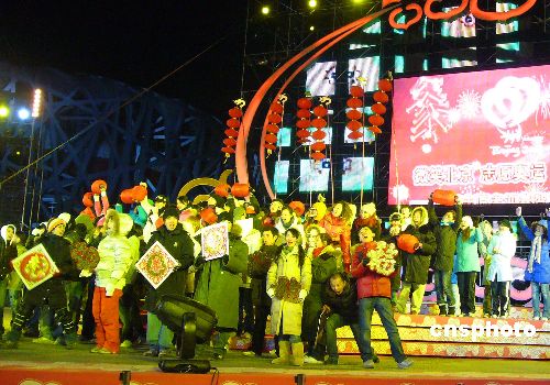 圖:“鳥(niǎo)巢”旁演員寒風(fēng)中為春晚彩排