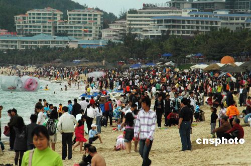 2月7日,中國(guó)傳統(tǒng)佳節(jié)春節(jié),中國(guó)唯一的熱帶濱海旅游城市海南三亞迎來(lái)大量中外游客,各大旅游景區(qū)人潮涌動(dòng)。中新社發(fā) 尹海明 攝