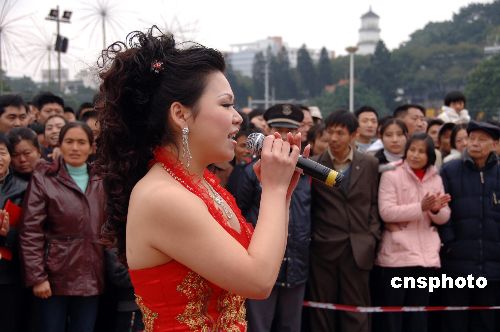 2月8日,福州市文化部門在五一廣場(chǎng)舉行了“榕城祝!蔽膴恃莩觯瑏碜陨綎|省的務(wù)工者畢君上臺(tái)表演,祝福留在福州過春節(jié)的外來民工新春愉快。中新社發(fā) 鄭祚聲 攝
