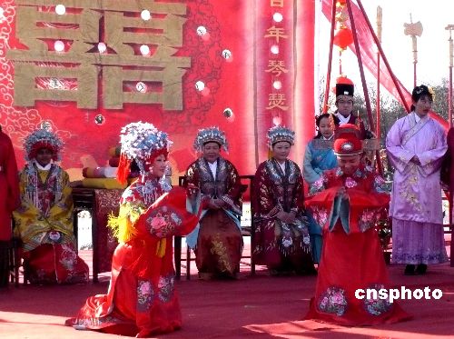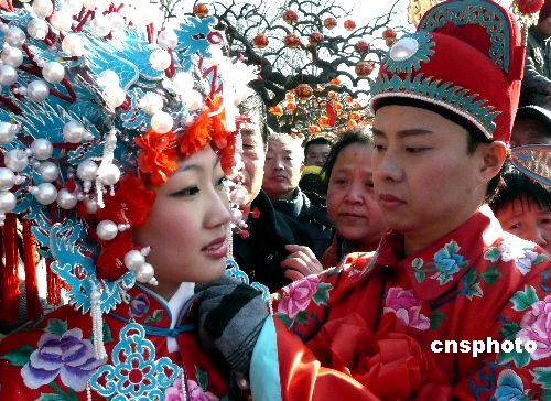 2月8日,由北京大觀園主辦的2008年紅樓廟會(huì)吸引眾多游客,在廟會(huì)傳統(tǒng)的“元妃省親”古裝游行的盛大場景中,大觀園為《紅樓夢》一書中未能成婚的賈寶玉、林黛玉專門舉行一場別開生面的“寶黛成婚”場面,令游客耳目一新。中新社發(fā) 錢興強(qiáng) 攝