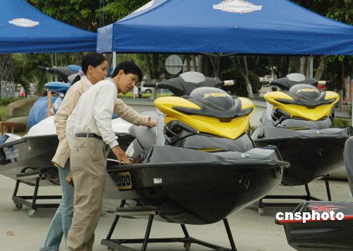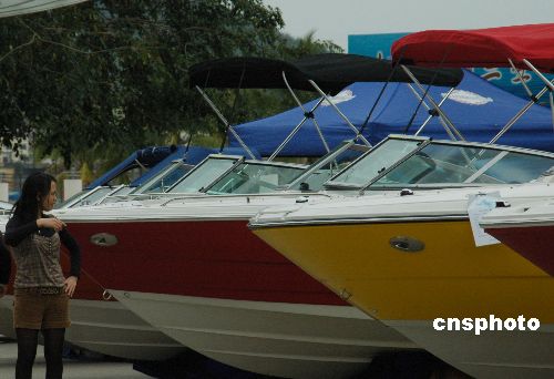 2月8日,游人在三亞鹿回頭廣場(chǎng)參觀豪華游艇。由三亞順業(yè)船舶設(shè)備有限公司和香港游艇廠商聯(lián)合舉辦的2008迎春游艇展覽會(huì)繼續(xù)在海南三亞鹿回頭廣場(chǎng)舉行,這是三亞首次舉行的大規(guī)模游艇展,展覽將持續(xù)到2月14日。所展出的圣斯克、夢(mèng)特威、斯莎等品牌的豪華游艇、摩托艇、快艇以及加拿大龐巴迪品牌旗下的快艇、雪地車(chē)、沙灘車(chē)等海上運(yùn)動(dòng)休閑娛樂(lè)產(chǎn)品,春節(jié)期間吸引諸多三亞市民和游客參觀。中新社發(fā) 尹海明 攝