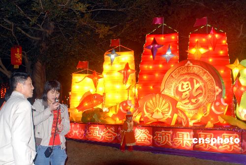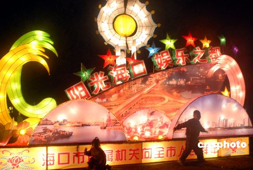 2008年2月7日晚,游人在“現(xiàn)代都市”燈前休閑觀賞。農(nóng)歷大年初一,眾多市民和游客到?谌f綠園觀賞“華燈璀璨耀椰城”大型燈展。中新社發(fā) 善平 攝