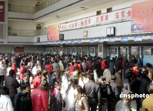2月9日,蘇州火車站售票大廳內(nèi)擠滿了排隊(duì)預(yù)購(gòu)返程火車票的乘客。新的休假辦法的實(shí)行,春節(jié)后上班日期由以往的正月初八變更為初七,因此購(gòu)票高峰也提前到來(lái)。當(dāng)日,蘇州火車站售票大廳內(nèi)人潮涌動(dòng),許多旅客紛紛提前購(gòu)買返程火車票。中新社發(fā) 王建康 攝