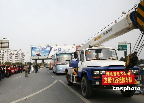 2月10日上午11時許,由171輛車組成的湖北支援江西電網(wǎng)的搶修車隊通過九江長江大橋抵達(dá)江西,搶修人員將趕赴咸夢線的搶修工地,修復(fù)咸夢線江西段134公里長受損電網(wǎng)。中新社發(fā) shendudu 攝