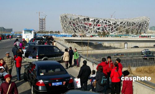 2月10日,位于國家體育場--鳥巢南側(cè)的北辰橋上大批市民在拍照留念,造成北四環(huán)擁堵。因高架橋上視野開闊,角度頗佳,拍照者多將私家車隨意停在行車道上,嚴(yán)重影響其他車輛通行。北京交警隨后趕到將人群疏散,禁止后續(xù)車輛無故在此?。中新社發(fā) 富田 攝