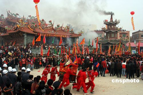 2月10日中午,廈門市同安區(qū)西柯鎮(zhèn)呂厝村四年一次民間民俗盛事--迎“王船”活動吸引了眾多的群眾。當?shù)孛癖娦欧畹倪@個王爺叫“代天巡狩”。傳說“代天巡狩”神威顯赫,總能替天行道,愛護百姓,當?shù)孛癖姸己芫囱鏊。因而,到了新舊王爺?shù)慕唤幽,當(shù)厝罕姸紩e行“送王”和“迎王”慶典,表達他們祈平安慶豐收的心情。通常,申子辰年(鼠、龍、猴年)為新舊王爺交接年,交接年間的正月初四為迎接新任王爺?shù)氖,同年的農(nóng)歷十月?lián)袢諝g送原任王爺,形成了四年一任的民間迎送王爺?shù)氖V行律绨l(fā) 吉辛 攝