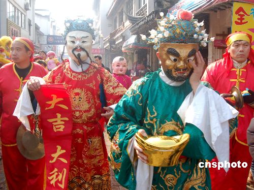 2月11日,兩名扮成“財(cái)神”的演員在蘇州南浩街巡游“送財(cái)”。據(jù)悉,蘇州民間素有農(nóng)歷正月初五“迎財(cái)神”的傳統(tǒng),各種形式的“迎財(cái)神”民俗活動(dòng),吸引了眾多市民和游客。中新社發(fā) 邱勇 攝