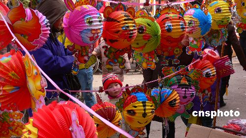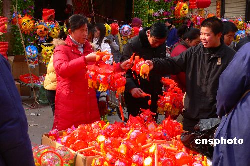 2月13日,人們在河南開封市大相國寺市場選購花燈。農歷正月十五臨近,古城開封市各種生肖動物、奧運福娃等圖形的燈籠紛紛上市,喜迎元宵佳節(jié)。中新社發(fā) 凱楓 攝