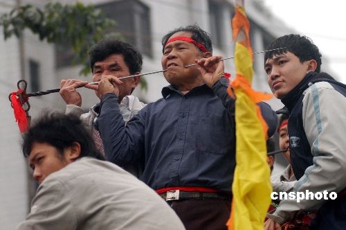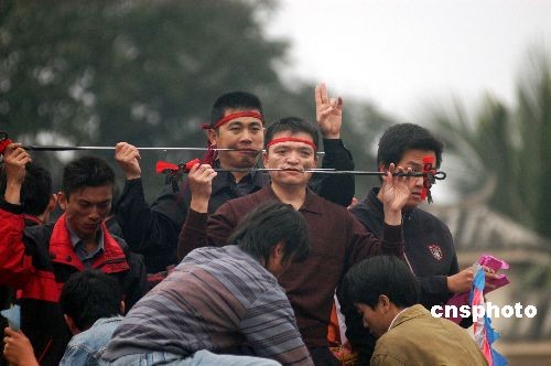 2008年2月16日,瓊海市,祈求五谷豐登,風調(diào)雨順!败娖隆笔呛D厦耖g的一個傳統(tǒng)節(jié)日,相傳源于唐代,為紀念六世紀我國嶺南著名俚人首領(lǐng)冼夫人而舉行的祭祀活動,距今已有1300多年歷史。獨特的民俗風情吸引了大批游客。中新社發(fā) 蒙鐘德 攝