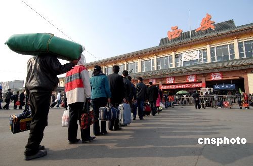 2月19日,旅客在西安火車站排隊有序進站乘車。元宵節(jié)將至,外出民工與返校學(xué)生流、探親流等客流全面啟動,西安火車站客流持續(xù)攀升。鐵路部門采取提前二小時進站、在廣場設(shè)立臨時候車區(qū)等措施,做好旅客乘車組織及服務(wù)工作,確?土鞲叻灏踩⑵椒(wěn)、有序。中新社發(fā) 唐振江 攝