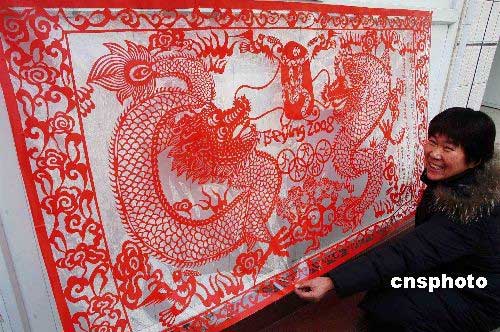 圖:河南周口藝人創(chuàng)作剪紙“龍迎奧運”