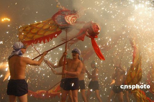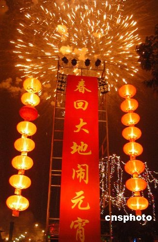 2月21日晚,四川綿陽市委、市政府主辦的“2008年元宵焰火晚會”在涪江河畔上演。3000發(fā)色彩繽紛的煙花持續(xù)30分鐘在涪江河畔濱江廣場上空競相綻放。元宵焰火晚會由廣場文藝演出、舞臺文藝演出及燃放焰火三部分組成。中新社發(fā) 成和平 攝