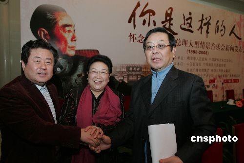 2008年3月5日是中國已故總理周恩來110周年誕辰,北京將舉辦系列紀念活動。2月25日下午,將于3月28日在北京人民大會堂舉行的大型情景音樂會《你是這樣的人》舉行新聞發(fā)布會,晚會總導(dǎo)演鄧在軍(中 周恩來侄媳)、藝術(shù)總監(jiān)、中華民族文化促進會副主席曾慶淮(右)、節(jié)目總監(jiān)、中國音樂家協(xié)會黨組書記徐沛東等出席。中新社發(fā) 任晨鳴 攝