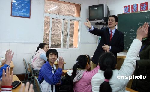 2月27日,英國外交大臣戴維·米利班德與重慶農民工子女同上英語課,學生們爭相與他交流。戴維·米利班德一行于26日抵達重慶開始為期兩天的訪問,這是他上任以來首次訪華。中新社發(fā) 郭晉嘉 攝