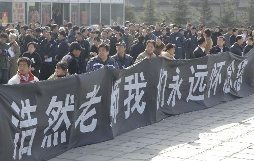 數(shù)百位專程從河北三河市趕來的市民打出悼念浩然的長幅。