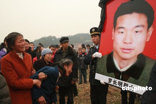 事件回放:2008年1月中旬,湖南省遭遇了50年罕見的冰雪災(zāi)害,電力設(shè)施遭到嚴(yán)重摧毀,羅海文、羅長明、周景華志愿加入到抗冰保電搶險(xiǎn)隊(duì)伍。2008年1月26日,他們冒著嚴(yán)寒、不顧危險(xiǎn)在長沙電廠——沙坪變電站500千伏輸電線路上進(jìn)行人工除冰,因41號(hào)、43號(hào)、44號(hào)鐵塔不堪冰雪重負(fù),相繼發(fā)生坍塌,他們3人隨即從高空墜落,壯烈犧牲。三位英雄壯烈犧牲后,湖南省開展向三位烈士學(xué)習(xí)的活動(dòng)。湖南省總工會(huì)追授他們?yōu)椤昂鲜∥逡粍趧?dòng)獎(jiǎng)?wù)隆睒s譽(yù)稱號(hào);共青團(tuán)湖南省委追授他們?yōu)椤昂鲜∥逅那嗄戟?jiǎng)?wù)聵?biāo)兵”。1月29日上午,國務(wù)院總理溫家寶親臨長沙指揮抗災(zāi)工作時(shí),親自看望慰問了三位英烈家屬。中新社發(fā) 郭國權(quán) 攝