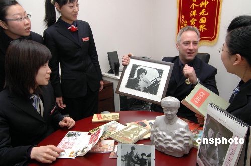 3月5日,“洋雷鋒”羅杰斯在“外國人學雷鋒我們怎么辦?”活動中展示自己收藏品。遼寧省錦州市商業(yè)銀行凌云支行外籍員工、美國人羅杰斯不但崇拜雷鋒,而且對學雷鋒情有獨鐘,收藏數(shù)百件有關(guān)雷鋒的物品,而且翻譯了雷鋒日記。他在工作、生活中堅持用雷鋒精神要求自已,做了很多有意義的事,為弘揚傳承雷鋒精神寫了大量文章,羅杰斯說雷鋒精神是一種超越國界、超越時空、超越意識形態(tài)的精神。中新社發(fā) 李鐵成 攝