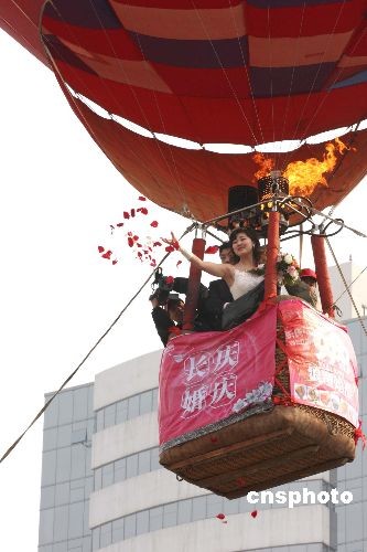3月8日,鄭州一對情侶乘坐熱氣球升空舉辦空中婚禮,隨著熱氣球的徐徐上升,空中的新娘手提花籃向下拋灑玫瑰花,新郎頻頻的向地上的親朋好友揮手致意,在熱氣球上,他們異口同聲的大聲呼喚:“祝天下的女士婦女節(jié)快樂”。中新社發(fā) 王中舉 攝