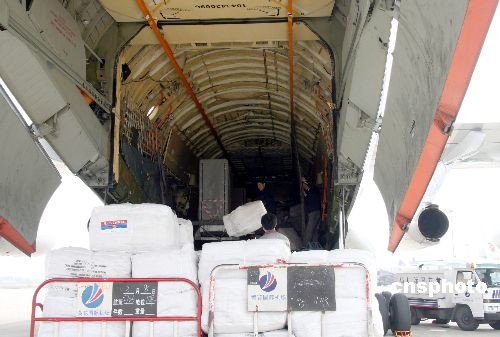 3月9日,俄羅斯聯(lián)邦政府向湖南災(zāi)區(qū)捐贈(zèng)了數(shù)千床棉毯和六臺(tái)發(fā)電機(jī)。這是湖南遭遇冰雪災(zāi)害后第一批由外國(guó)政府直接向該省捐贈(zèng)的救災(zāi)物資。當(dāng)日下午1時(shí)許,這些救災(zāi)物資由俄羅斯專機(jī)直接從莫斯科運(yùn)抵長(zhǎng)沙黃花機(jī)場(chǎng)。圖為機(jī)場(chǎng)員工正在卸運(yùn)物資。中新社發(fā) 鄧霞 攝